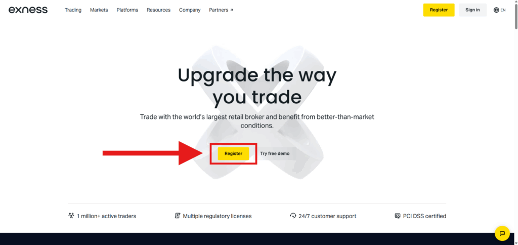 初めにExnessの公式サイトに入り「Register」を押しましょう。
