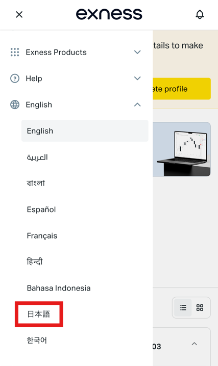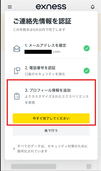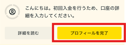 Exnessの公式サイトにログインをした後は、黄色で表示されている「プロフィールを完了」ボタンを押して次に進みましょう。