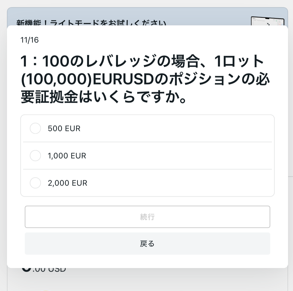 証拠金の知識を質問された場合、回答はロット額÷レバレッジになります。今回は100,000÷100で1,000EURを選択します。