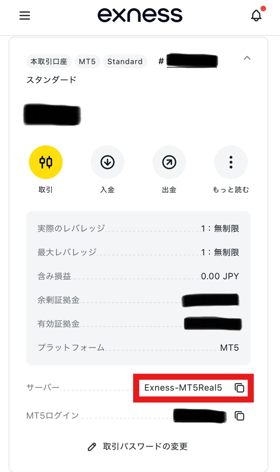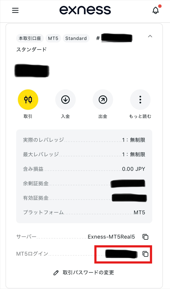 ログイン名:Exnessマイアカウントの口座『MT5ログイン』