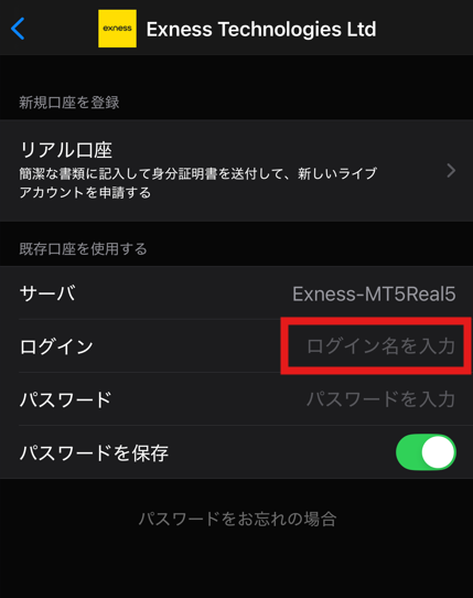 アプリをインストールしたら、Exnessの口座情報でログインすることで取引を開始できます。