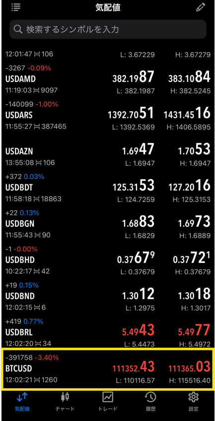 画面を戻ると下に『BTCUSD』が追加されているのを確認できます。