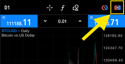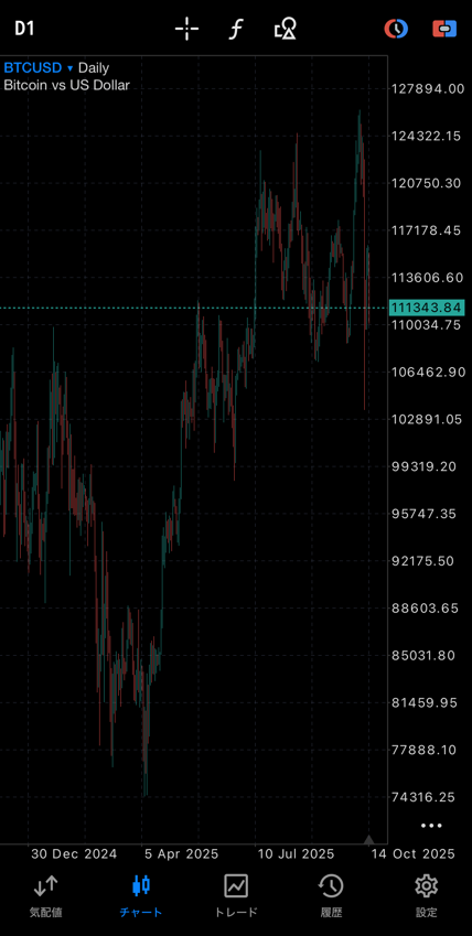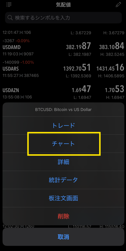 次に『BTCUSD』をタップし、『チャート』をタッチすると表示されます。