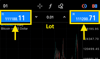 真ん中で取引数量の選択ができるので、注文内容が決まれば「売り・買い」のボタンをクリックしエントリーしましょう。