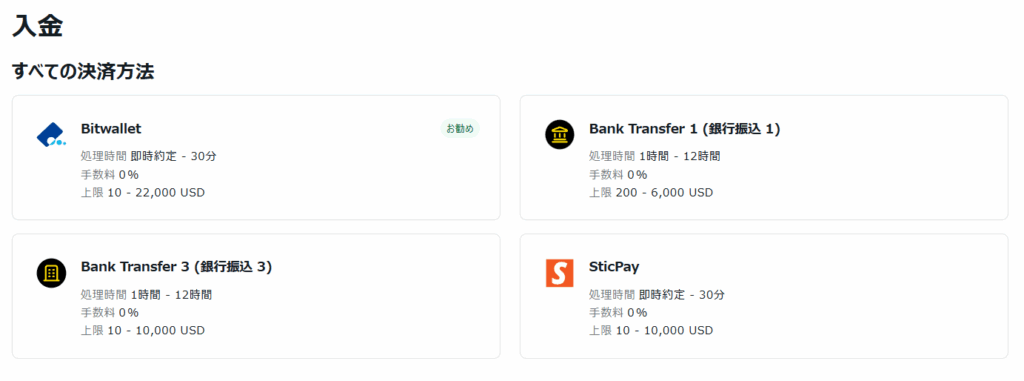 なかでもオススメは銀行振込です。振込/出金手数料完全0円、申請から10分で口座に反映されます。ただし、入金最低額は10ドル(およそ1500円)になるので注意が必要です。